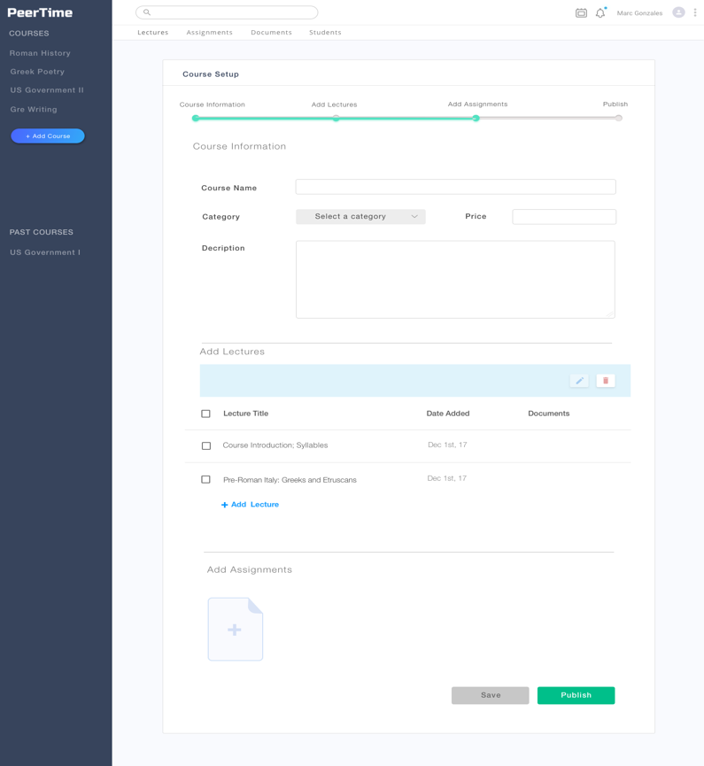 This is a Course setup page, where the Tutor can manage the course information like add Lectures, Assignments, etc. Also the Tutor can navigate directly to Documents, Students by selecting a course from the left side-panel first.