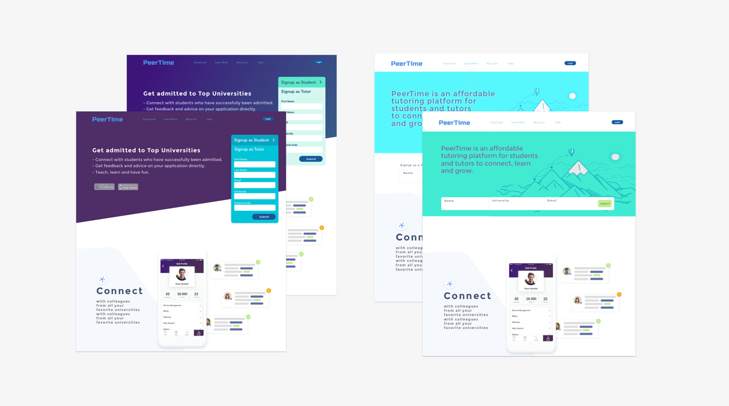 The founders of the company were interested in using a playful theme to attract the K7-K12 demographic, so I made various concepts for them to get an understanding of their taste. I also worked on the logo and branding for PeerTime.