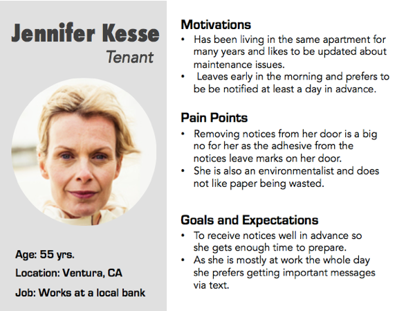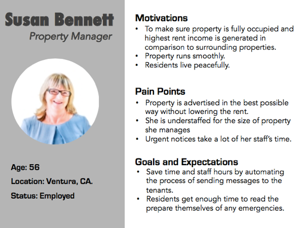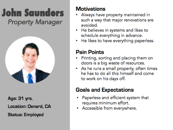 From our stakeholder interviews, we were able to create personas — fictional users that encapsulate the needs, behaviors, and goals of distinct groups of property managers and tenants. I focused on understanding the needs of our primary personas Susan Benett and John Saunders(poperty managers),which dictated the product requirements for the design.